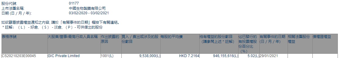 智通财经APP获悉,香港联交所最新资料显示,1月29日,GIC Private Limited增持中国生物制药(01177)953.80万股,每股作价7.2164港元,总金额约为6883万港元。增持后最新持股数目约为9.46亿股,最新持股比例为5.02%。
