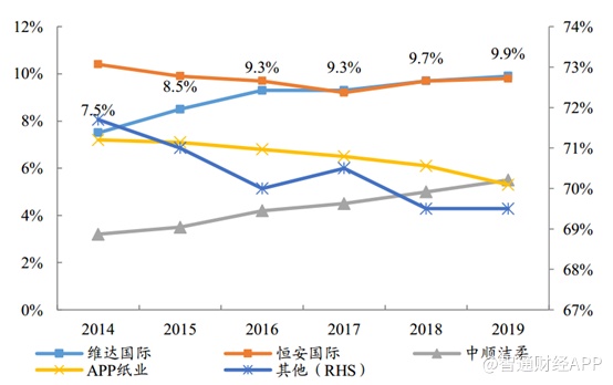 不过纸巾市场竞争依然激烈,数据显示2019年国内零售纸巾市场中,维达国际市场份额9.9%排名第一,恒安国际(01044)紧随其后排名第二,其后还有中顺洁柔(002511.SZ)、APP纸业等,但总体而言行业集中度不高。但是公共卫生事件的出现,使得中小规模企业利润难以为继,市场重新洗牌,头部企业市场份额得以提升,包括维达国际。