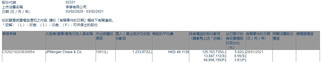 智通财经APP获悉,香港联交所最新资料显示,1月29日,摩根大通增持李宁(02331)约123.40万股,每股作价49.1138港元,总金额约为6060.51万港元。增持后最新持股数目约为1.25亿股,最新持股比例为5.02%。