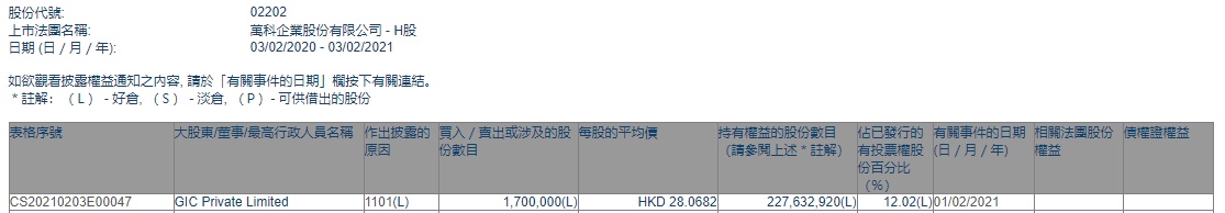 智通财经APP获悉,香港联交所最新资料显示,2月1日,GIC Private Limited增持万科企业(02202)170万股,每股作价28.0682港元,总金额约为4771.59万港元。增持后最新持股数目约为2.28亿股,最新持股比例为12.02%。