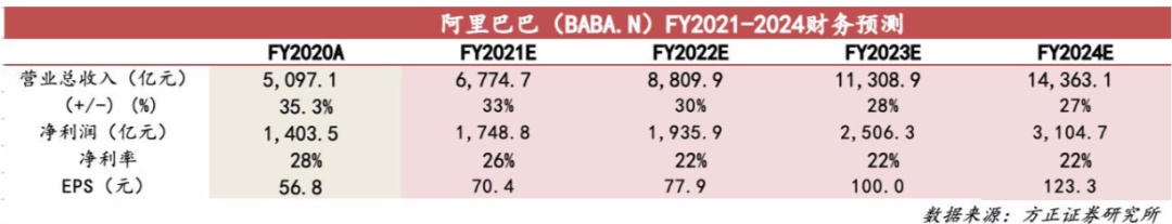 1、主要财务指标分析:监管环境的变化对公司业务基本面冲击较小,疫情下公司核心电商业务抗压能力强,直播电商等新模式赋能,业绩增长超预期,企业上云需求推动阿里云快速扩张,社区团购+本地生活+全球化+数字化全面布局新兴产业实现多引擎驱动协同发展。