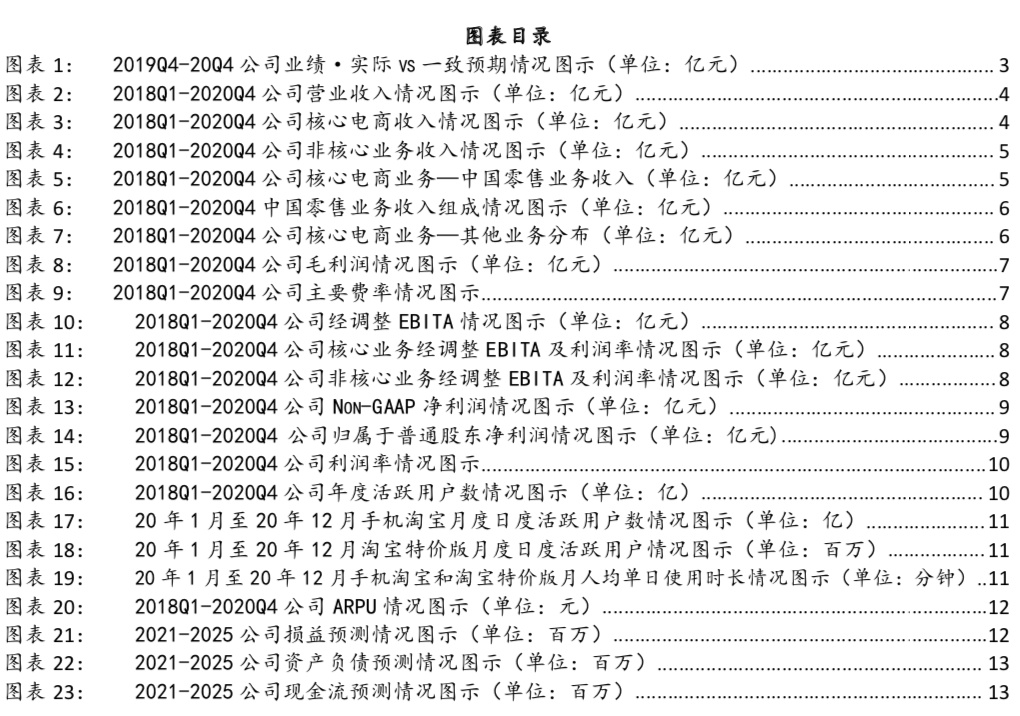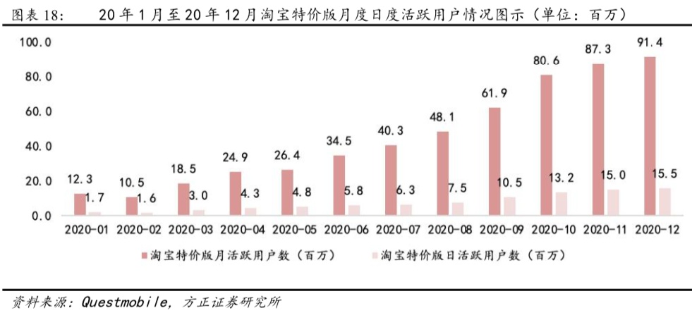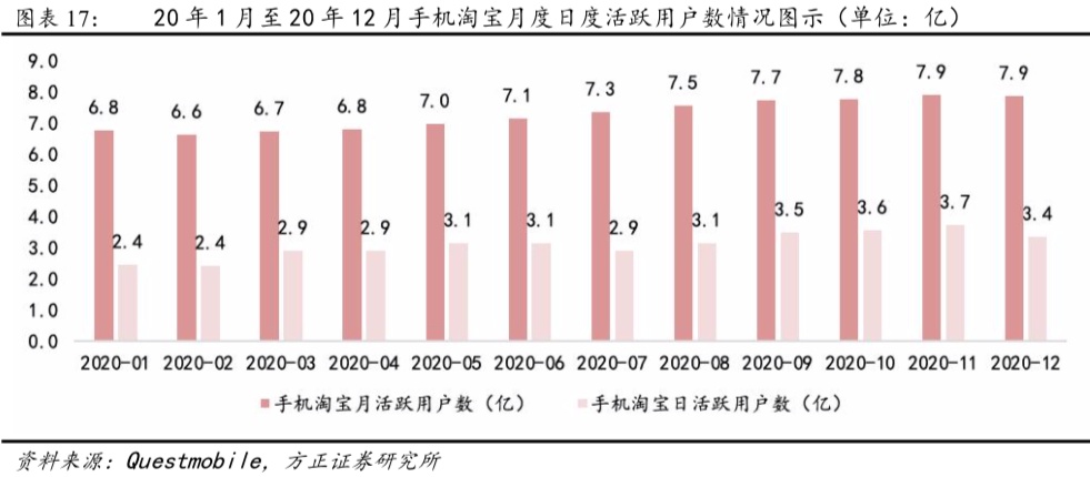 (2)APP月度活跃用户数:20Q4公司移动APP月活跃用户数达到9亿,相比较上一季度增长2100万。20年12月,手机淘宝月度活跃用户数7.9亿,淘宝特价版月度活跃用户数0.91亿,截至2020年2月3日,淘宝特价版用户规模已突破1亿。