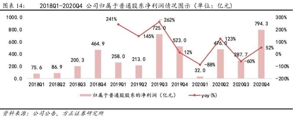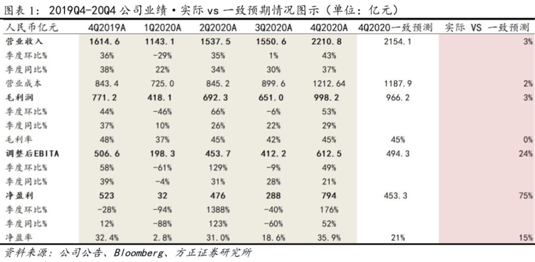 毛利及毛利率:20Q4公司毛利为998.2亿元(YoY +29%, QoQ +53%),毛利率为45% (QoQ +3pct,YoY -3pct)