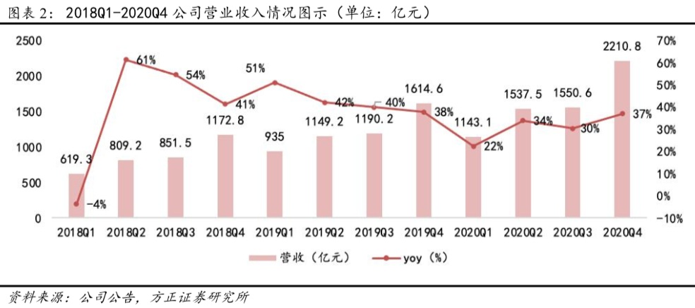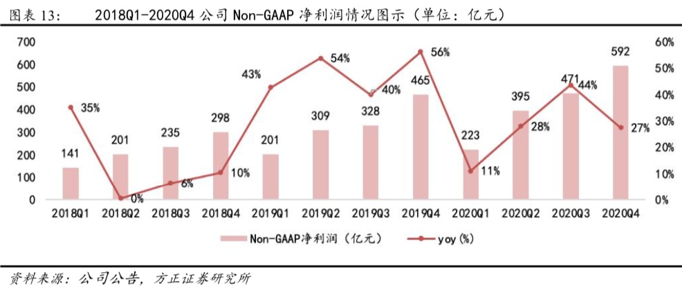 业绩总览:20Q4公司实现营业收入2,210.8亿元(YoY +37%,QoQ +43%),毛利润998.2亿元(YoY +29%, QoQ +53%),经调整EBITA为612.5亿元(YoY +21%,QoQ +49%),Non-GAAP净利润592亿元(YoY +27%, QoQ +26%),归属普通股东净利润为794.3亿元(YoY +52%, QoQ +176%)利润率为36%。