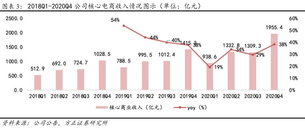 分业务收入:20Q4公司核心电商业务高速发展,实现收入1,955.4亿元(YoY +38%, QoQ +49%);非核心业务中,企业数智化需求推动阿里云迅速发展,云计算实现收入161.2亿元(YoY +50%,QoQ +8%);数字媒体及娱乐实现收入80.8亿元((YoY +9%, QoQ +0%),创新战略和其他实现收入13.5亿元(YoY -28%, QoQ +15%)。