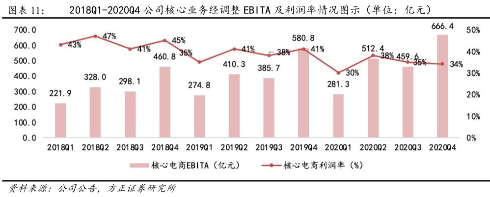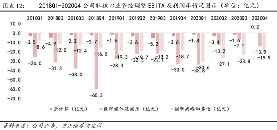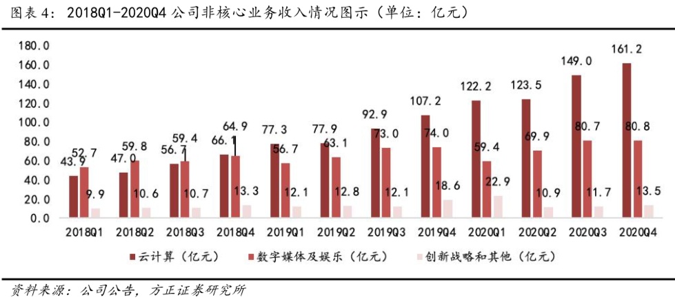 经调整EBITA情况: 20Q4公司实现核心电商经调整EBITA 612.5亿元(YoY +21%, QoQ +49%),云计算经调整EBITA 0.2亿元(YoY 107%, QoQ 115%) 首次实现正收入,数字媒体及娱乐经调整EBITA -13.9亿元(YoY -58%, QoQ +96%),创新战略和其他经调整EBITA-19.9亿元(YoY +7%, QoQ -16%)亏损进一步收窄。