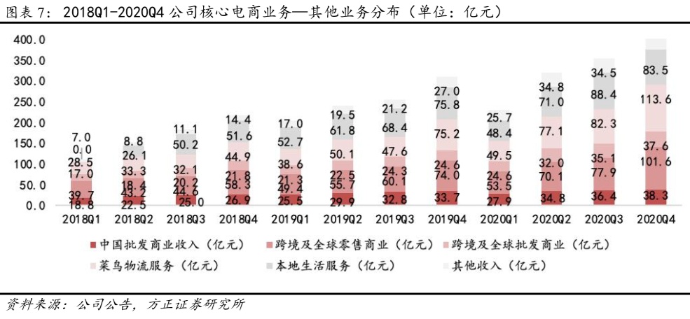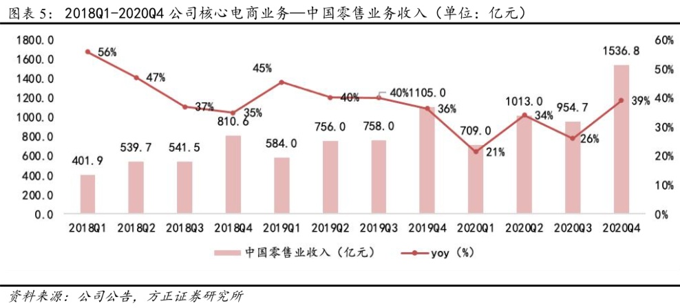 分类型收入:20Q4公司核心电商业务中:中国零售业实现收入1536.8亿元(YoY +39%, QoQ +61%),其中,客户管理业务实现收入1019.2亿元(YoY +20%,QoQ +47%)得益于增值服务提升了付费商家的平均支出;其他业务(主要包括天猫超市、盒马、进口直营和银泰)实现收入517.6亿元(YoY +101%,QoQ +98%)业务运营效率提高,高增长来源于新的变现模式和转化率的提升。