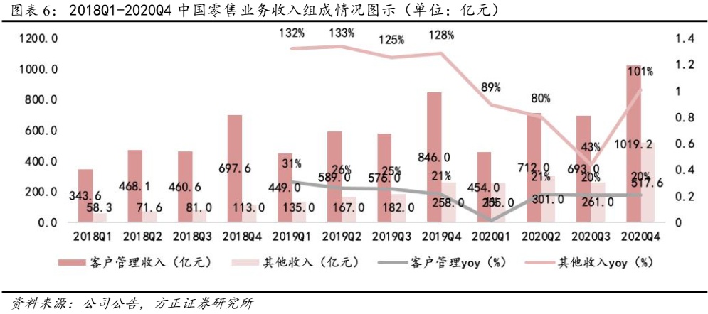 分类型收入: 20Q4公司核心电商业务中:中国零售业实现收入1,536.8亿元(YoY +39%, QoQ +61%),其中,客户管理业务实现收入1,019.2亿元(YoY +20%,QoQ +47%)得益于增值服务提升了付费商家的平均支出;其他业务(主要包括天猫超市、盒马、进口直营和银泰)实现收入517.6亿元(YoY +101%,QoQ +98%)业务运营效率提高,高增长来源于新的变现模式和转化率的提升。
