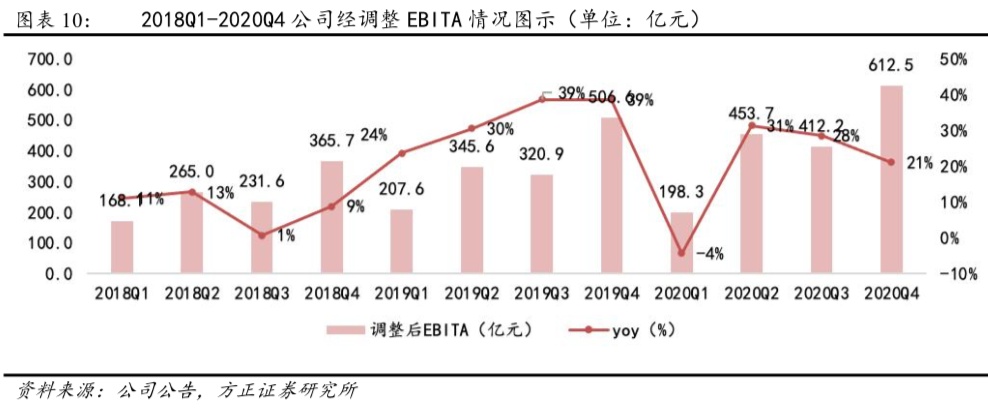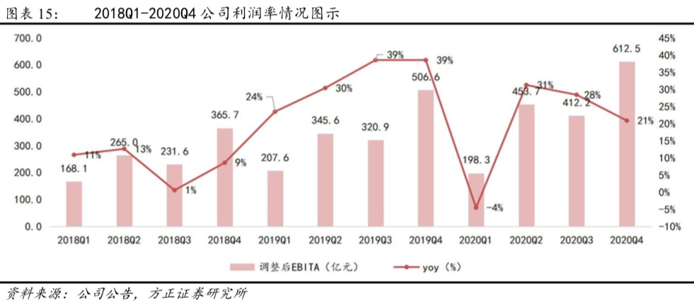 20Q4公司实现营业收入2210.8亿元(YoY +37%,QoQ +43%),毛利润998.2亿元(YoY +29%, QoQ +53%),经调整EBITA为612.5亿元(YoY +21%,QoQ +49%),Non-GAAP净利润592亿元(YoY +27%, QoQ +26%),归属普通股东净利润为794.3亿元(YoY +52%, QoQ +176%)利润率为36%。