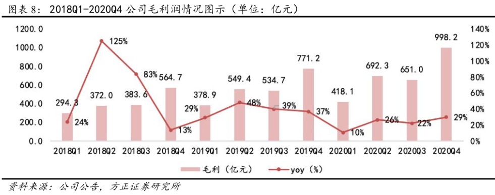 毛利及毛利率情况:20Q4公司毛利为998.2亿元(YoY +29%, QoQ +53%),毛利率为45% (QoQ +3pct,YoY -3pct)。