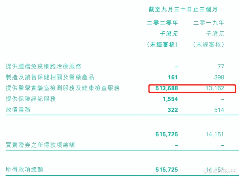 智通财经APP从三季度财报发现,中国生物科技服务的医学实验室检测服务及健康检查服务在2020年第三季度录得约5.14亿港元收入,同比暴增38倍。正是得益于该业务收入的大幅增长,公司2020年前三季度的收入增长11.8倍至5.47亿,净利润扭亏为盈至1.34亿港元,盈利能力大幅提升。