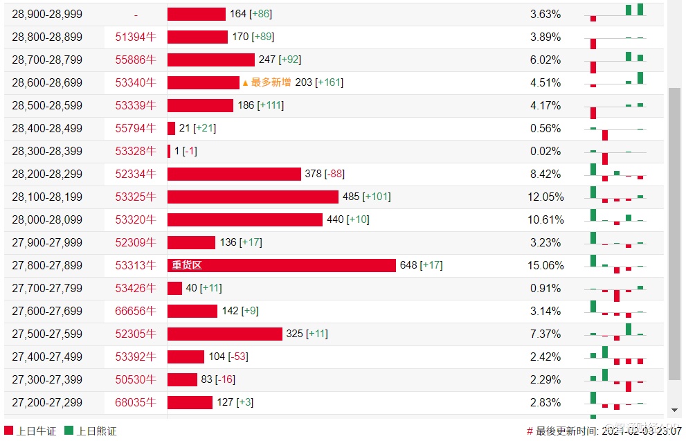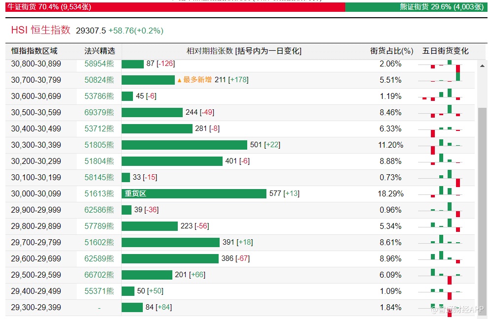 法兴恒指牛熊证街货分布图中的数据显示,熊证街货重货区在30000-30099区间,该区间最新熊证数量为577张,较上一交易日增加13张,最多新增在30700-30799区间,该区间最新熊证数量为211张,较上一交易日增加178张。牛证街货重货区在27800-27899区间,该区间最新牛证数量为648张,较上一交易日增加17张。最多新增在28600-28699区间,该区间最新牛证数量为203张,较上一交易日增加161张。
