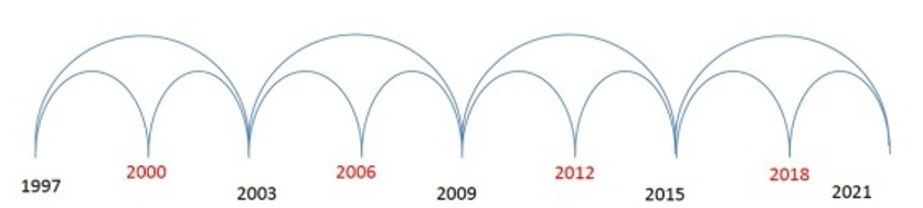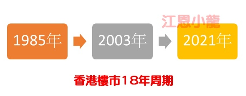 小龙在不同的地方提出香港楼市周期: 香港楼市周期不难发现,以六年为一个周期,以1997年开始计算,之后每约六年都发生大转变,包括2003,2009,2015,2021年;我们同样可以利用江恩的50%分割,得出三年为次一级周期,分别得出2000,2006,2012,2018年。