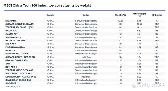 智通财经APP获悉,2月4日下午消息,MSCI明晟公司发布MSCI中国科技100指数。其中,信息科技公司占比最大,电子商务公司多达29家,美团-W(03690)权重最高,为12.85%。此外,前五位还包括阿里巴巴(09988)、腾讯(00700)、百度(BIDU.US)及京东(09618)。