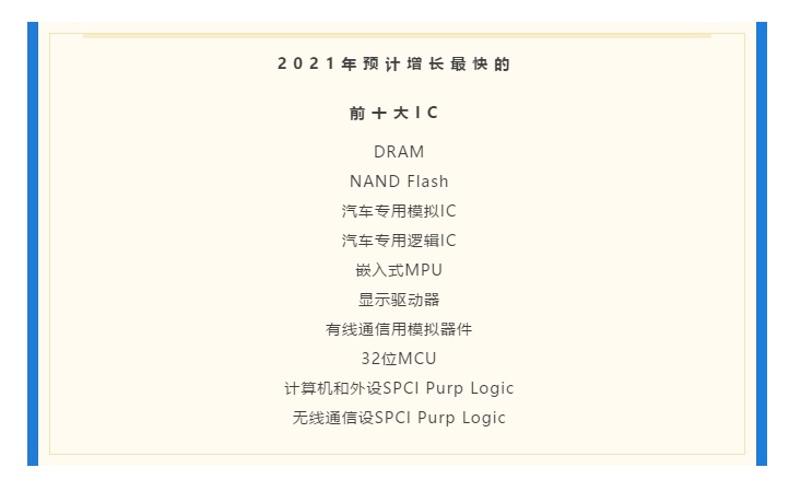 IC Insights最近发布了2021年版《麦克林报告》,对IC行业进行了分析和预测,并公布了2021年增长最快的十大集成电路(IC)类别排名预测。