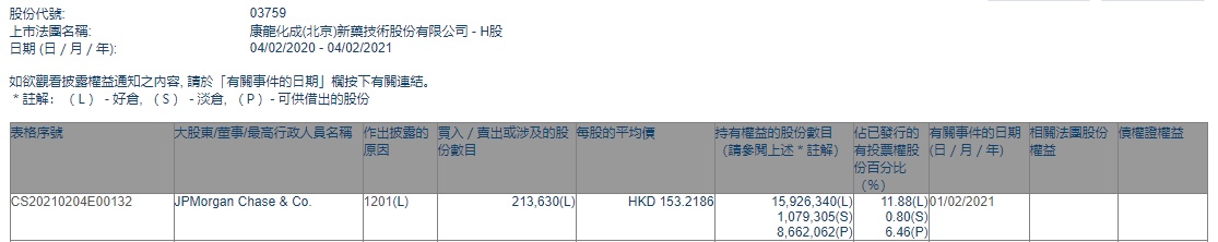 智通财经APP获悉,香港联交所最新资料显示,2月1日,摩根大通减持康龙化成(03759)21.363万股,每股作价153.2186港元,总金额约为3273.21万港元。减持后最新持股数目约为1592.63万股,最新持股比例为11.88%。