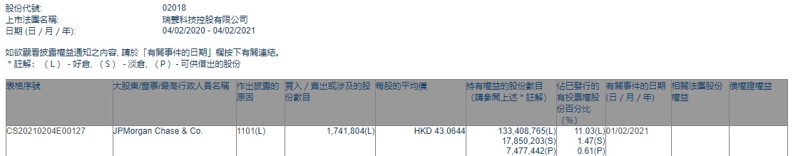 智通财经APP获悉,香港联交所最新资料显示,2月1日,摩根大通增持瑞声科技(02018)174.1804万股,每股作价43.0644港元,总金额约为7500.97万港元。增持后最新持股数目约为1.33亿股,最新持股比例为11.03%。
