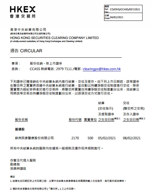 智通财经APP获悉,港交所今日(2月4日)发布通告表示,贝康医疗-B(02170)已获接纳在中央结算系统内进行结算、交收及提存。由下列上市日期起,该等证券在联交所之买卖将透过中央结算系统进行结算,并自动以持续净额交收制度进行交收,除非买卖双方经纪参与者于进行交易时,将联交所买卖自持续净额交收制度划分出来,或结算公司将该等交易自持续净额交收制度划分出来,以逐项交收方式进行交收。