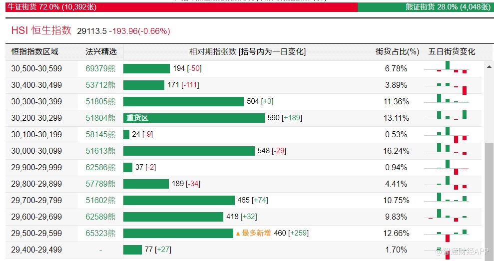 智通财经APP获悉,截至2月4日,恒指最新的牛熊街货比例为72:28。