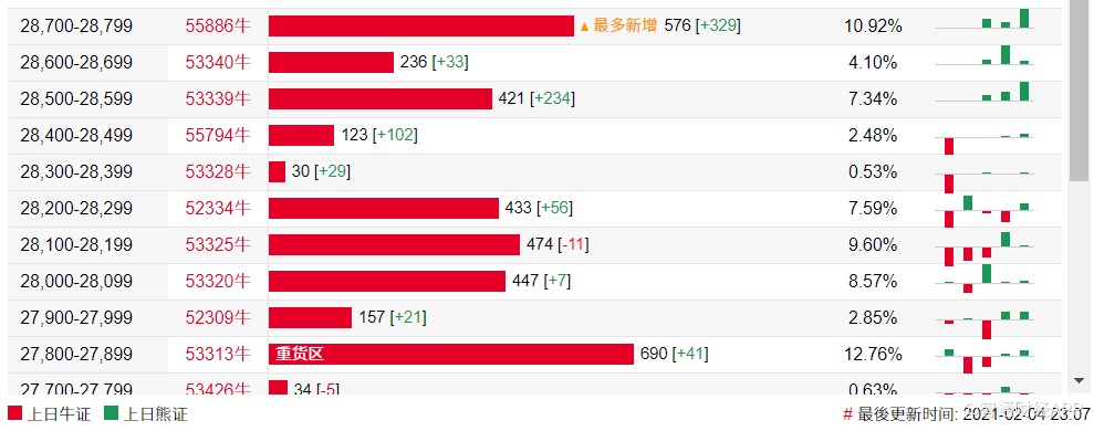 法兴恒指牛熊证街货分布图中的数据显示,熊证街货重货区在30200-30299区间,该区间最新熊证数量为590张,较上一交易日增加189张,最多新增在29500-29599区间,该区间最新熊证数量为460张,较上一交易日增加259张。牛证街货重货区在27800-27899区间,该区间最新牛证数量为690张,较上一交易日增加41张。最多新增在28700-28799区间,该区间最新牛证数量为576张,较上一交易日增加329张。