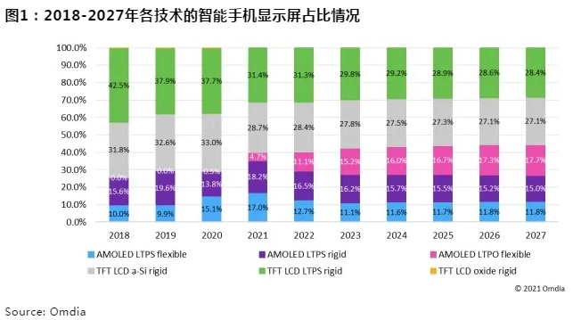 该机构认为,从2021年起,a-Si TFT LCD在智能手机显示屏市场的占有率将下降到30%以下;从2023年起,LTPS TFT LCD在智能手机显示屏市场的占有率将降至30%以下;2026年,OLED显示屏预计将占所有智能手机显示屏的45%,而LTPS TFT LCD占比将下降到28.6%,a-Si TFT LCD占比将下降到27.1%。