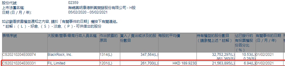 智通财经APP获悉,香港联交所最新资料显示,2月1日,FIL Limited减持药明康德(02359)26.17万股,每股作价189.9230港元,总金额约为4970.3万港元。减持后最新持股数目约为2156.4万股,最新持股比例为6.94%。