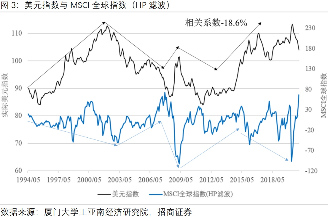 周颖刚教授认为,美元周期对全球贸易、股票市场、大宗商品价格、跨境资本流动、人民币汇率等都会产生影响。一是,美元指数与全球商品和服务出口相关系数为-44.6%,意味着弱美元将促进全球贸易和经济弹性,并有助于减少贸易失衡。二是,美元指数与MSCI全球指数(HP滤波)相关系数为-18.6%,意味着弱美元将推动股票市场上涨。三是,美元指数与CRB现货指数的相关系数为-20.3%,意味着弱美元将推涨大宗商品价格。四是,美元指数与全球投资组合证券净流入相关系数为-36.4%,意味着弱美元将促进全球资本跨境流入,推动资产价格上涨甚至出现泡沫。五是,美元指数与人民币兑美元汇率相关系数为82.4%,与CFETS人民币汇率指数相关系数为-37.7%,意味着弱美元可能带动人民币被动升值。