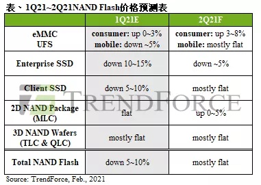 TrendForce集邦咨询表示,近两周以来,主要由于笔电需求仍持续增加,PC OEM对供应商进一步积极要求加单client SSD,造成NAND Flash需求同步增温。除此之外,上游供应商的库存水位先前已因智能型手机增加备货而下降,且在资料中心客户将自第二季起恢复采购的预期下,减少供给毛利较低的NAND Flash wafer市场,使得NAND Flash wafer合约价已连续两个月(含去年12月与今年1月)跌幅表现收敛。