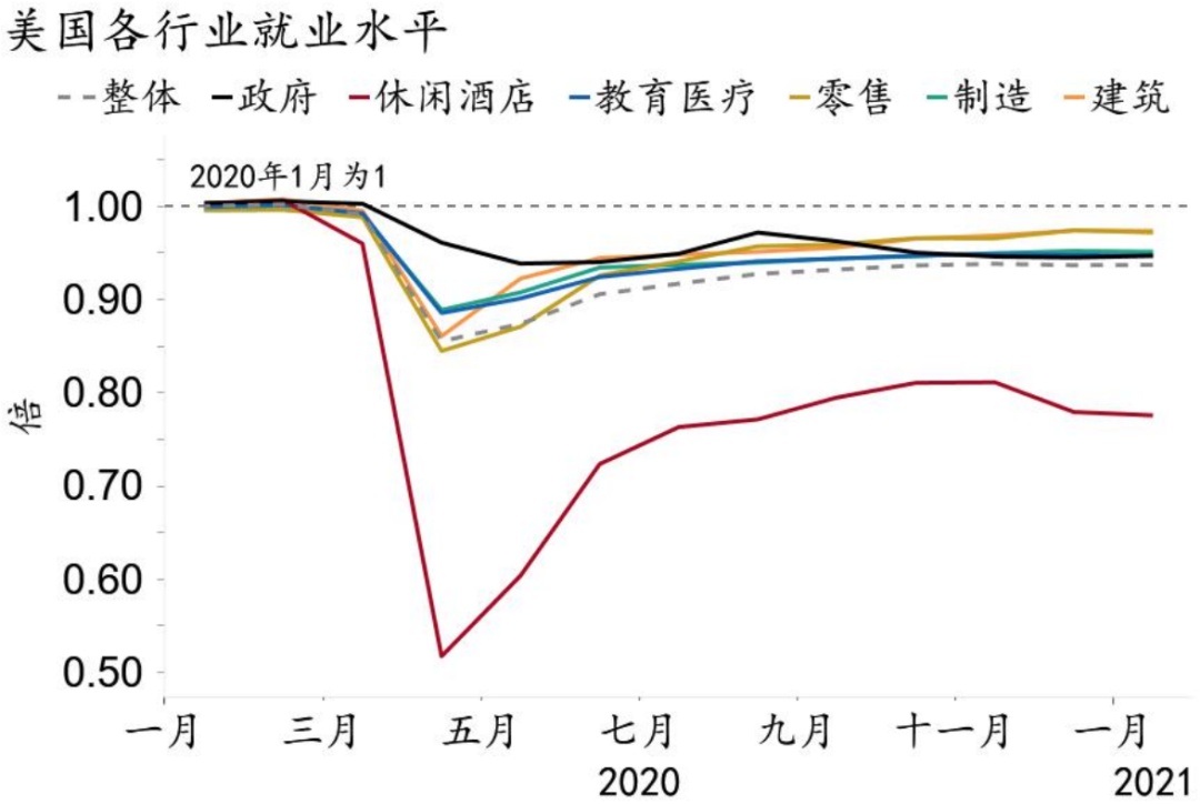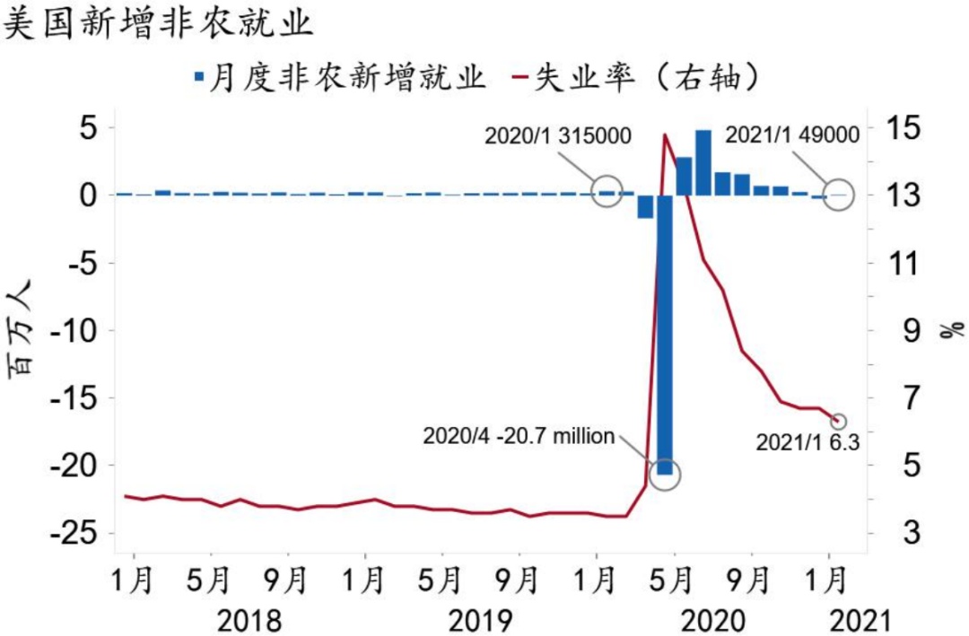 前瞻的看,美国就业修复有望于近期提速。前期影响就业的三个因素近期均出现改善:一是疫情出现好转。一月初以来,新增感染人数开始回落,目前稳定在12万/天左右。二是疫苗接种大幅提速。截至2月5日已接种疫苗超过3,500万剂,接种率达到8.3%。三是财政刺激开始发力。目前9,000亿美元的财政补贴已经落地,此外民主党正在寻求单方面通过总额约1.9万亿的“美国救助计划”(American Rescue Plan)财政刺激法案。