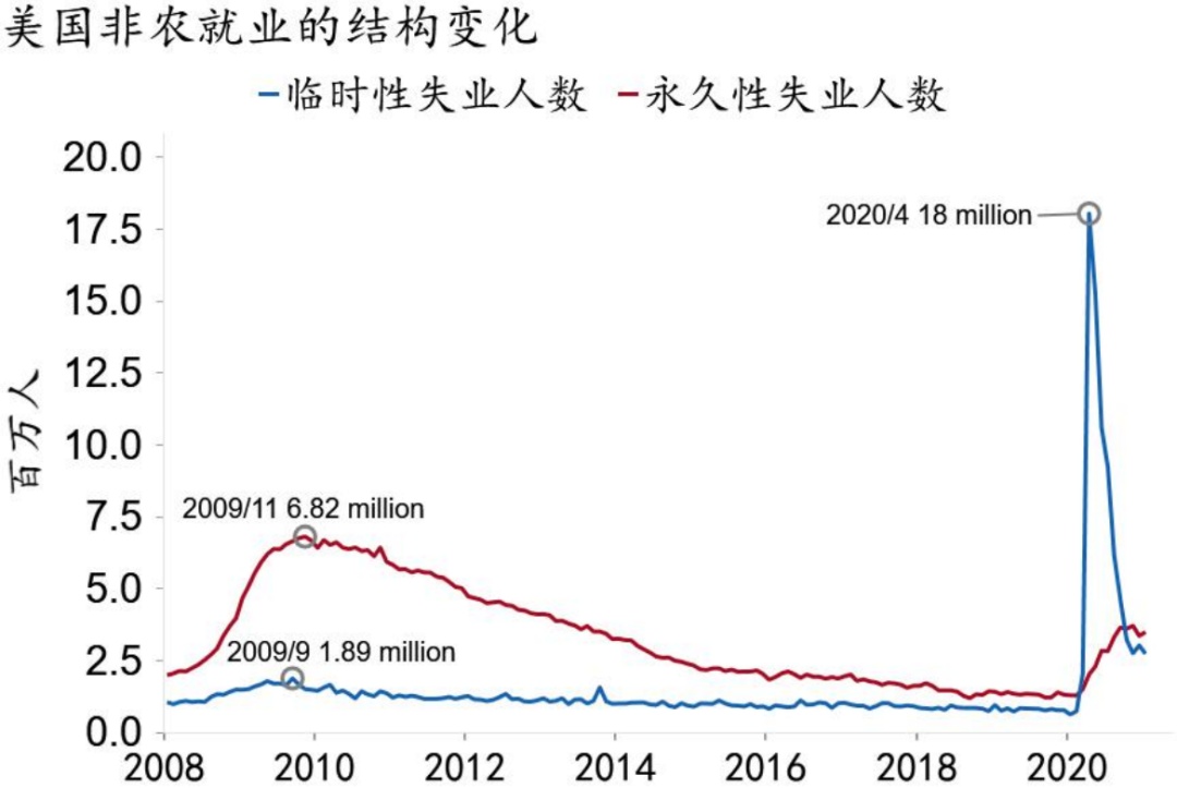 二是新增就业主要来自临时性失业的下降。1月份临时失业数为274.6万,较前值减少近30万,是新增非农就业的6倍。相较之下,永久性失业人数再次上升13.3万,达到350.3万,“永久-临时失业差”扩大至75.7万。