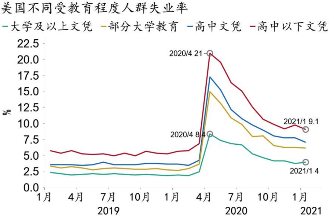 三是不同群体间失业率修复差异明显,低收入群体修复较为明显。从年龄段看,16-19岁的青少年(teenagers)反弹最快,环比减少1.2pct,而成年男性环比仅减少0.4pct。从族裔看,西裔(0.7pct)与非裔(0.7pct)的修复情况比白人(0.3pct)、和亚裔(-0.7pct)更好。从学历看,受教育程度越低的群体修复程度越好,高中以下学历和高中学历人群失业率均减少0.7pct,而大学以上学历失业率则出现上升(0.2pct)。