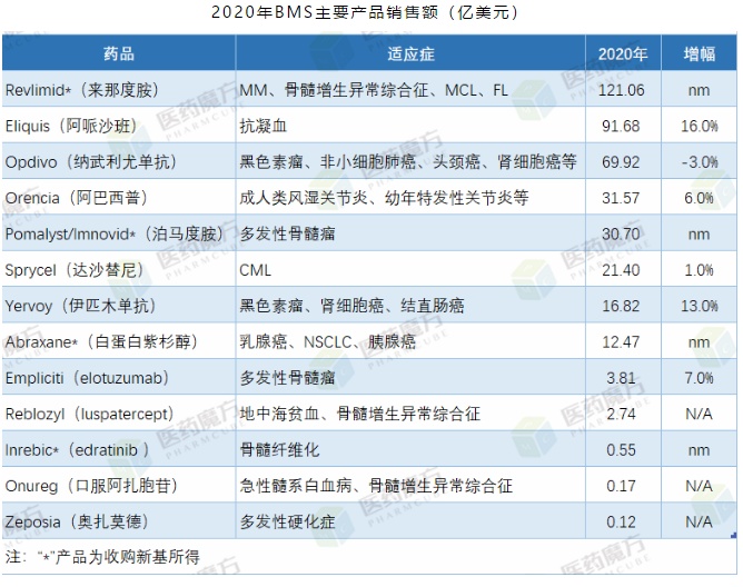收购Celgene之后,BMS的上市产品管线中拥有了Revlimid(来那度胺)、Eliquis(阿哌沙班)、Opdivo(纳武利尤单抗)、Orencia(阿巴西普)、Pomalyst(泊马度胺)组成的豪华阵容,5款产品合计贡献345亿美元的收入。Revlimid成为了BMS的新头牌,全年销售额也达到了121.06亿美元的新高度。随着Celgene之前跟Natco、Dr. Reddy达成专利和解,美国市场来那度胺仿制药最早在2022年3月出现,Revlimid销售额或可再创新高。