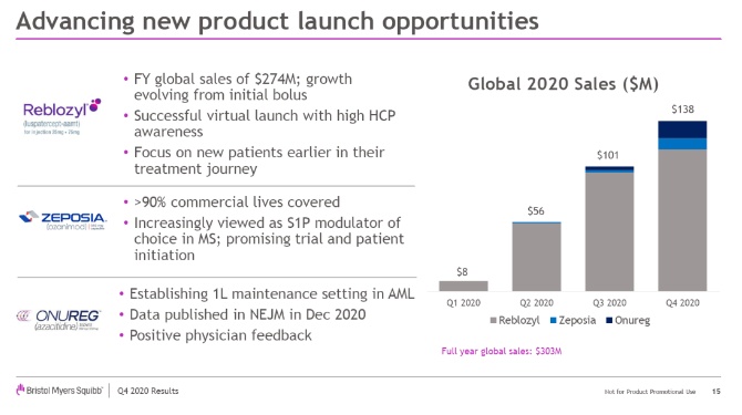 BMS当前上市的产品中,几款重磅炸弹药物也算成名多年,为大家熟知。更大的看点还是在新近上市的几款产品和在研药物身上,比如2019年获批的全球首个红细胞成熟剂,同时也是近10年来批准的首个用于骨髓增生异常综合征的新药Reblozyl(luspatercept,ACVR2B-Fc融合蛋白 );2020年3月获批用于治疗多发性硬化的新一代高选择性S1PR1/5抑制剂Zeposia(奥扎莫德);2020年9月获批的微创新制剂Onureg(口服阿扎胞苷),是第一个作为一线维持疗法可延长急性粒细胞白血病总生存期的药物;以上3款新药在2020年合计带来了1.38亿美元的收入,是驱动BMS未来业绩增长的关键力量。