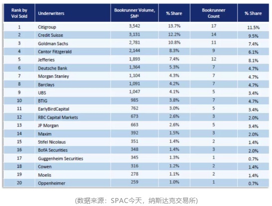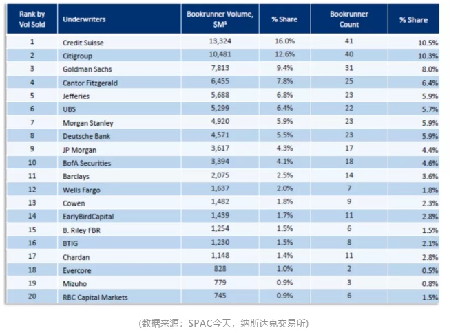 比较下图是2020年美国各大投行的SPAC发行排名榜,瑞士信贷、花旗银行和高盛集团占据SPAC发行券商的前三名: