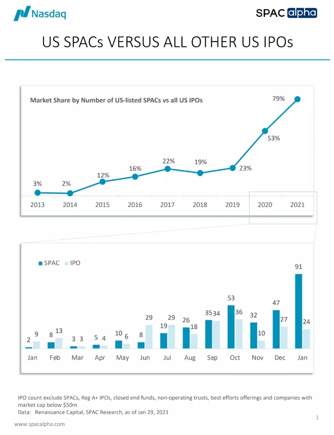 下图是SPAC发行在所有IPO中的占比情况。7年前SPAC在IPO中只有2%的比率。2019年前SPAC占比是大约20%。去年在所有首次公开上市中,SPAC占比到达53%。今年开年以来,SPAC占IPO的比率到达79%。对于绝大多数计划公开上市募集资金的公司而言,SPAC已经成为最主流的选择。