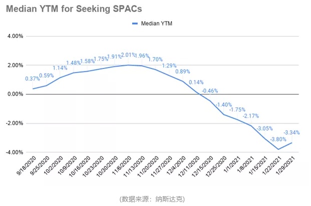 由于SPAC存在信托价值和股价之间的收益率,因此,投资人可以根据收益率来进行套利操作。SPAC的并购发生前股价可以在信托净值上下出现折价或者溢价。下图是SPAC全行业的过去六个月的到期收益率(YTM)的变化情况。