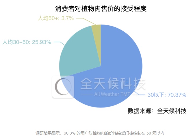 全天候科技通过上述调研问卷了解到,近七成的受访者表示,希望植物肉的人均消费价格不超过 30 元。