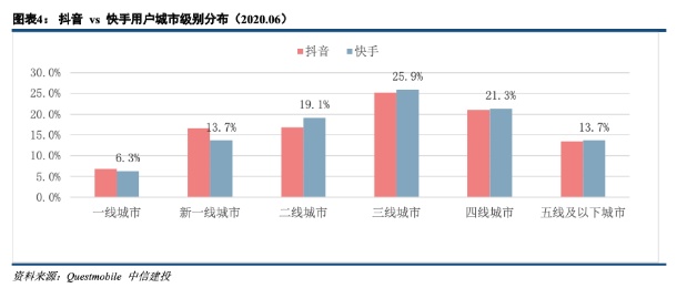 1)用户画像的拓宽:2018年的快手用户表现为年轻化+下沉化。据TalkingData快手用户62.5%为25岁及以下用户(远超移动互联网平均的29.8%),并且快手在三、四和五线及以下城市的用户比例高于移动互联网平均1.7pct、3.5pct、1.9pct;2019年的快手用户拥有更多休闲时间,抖音用户相较快手用户的作息整体偏向一二线城市的日常工作节奏;2020年快手用户尚未完全摆脱下沉用户的标签特征,2020年1月快手三线及以下城市用户群体占比为60.83%,抖音为45.37%。因此,快手从下沉市场突破一二线城市不能单纯依靠推广获客,还是要从平台内容出发;