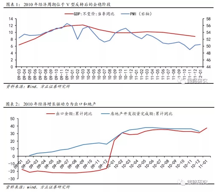 2010年经济周期位于V型反转后的高位企稳阶段,货币信用相对充裕。2010年全年经济基本延续了2009年以来的复苏趋势,受到基数因素影响,经济增速在2010Q1达到峰值(12%),随后虽有所下滑但基本保持在10%左右的增速,全年增速达到10.6%,整体呈现高位企稳的特征。2010年经济改善的驱动力来自于外需以及地产投资。出口在金融危机担忧消除后大幅改善,由2009年底的-16%反弹至2010年底的31%;地产投资再上台阶,弥补了基建投资增速下滑的空缺,制造业投资则基本持平,维持在26%左右的增速。2010年货币政策处于紧缩的开端,在四季度通胀抬头后陡然加码。货币政策在2010年开始试探性紧缩,标志是1月18日央行上调存款准备金率,政策超预期早调。7月温总理在调研时释放政策由压转保的信号,货币政策紧缩放缓。10月份开始央行紧缩政策陡然加码,四季度央行加息两次,上调存款准备率3次。流动性方面,从社融来看,2010年社融规模同2009年的天量社融基本持平,融资需求旺盛;从货币供应量来看,2010年全年M2增速前高后低,由年初的26%下移至年底的20%,全年维持在较高水平;总体而言,虽然2010年货币政策开始收紧,但2010年流动性仍然保持较为充裕的状态。