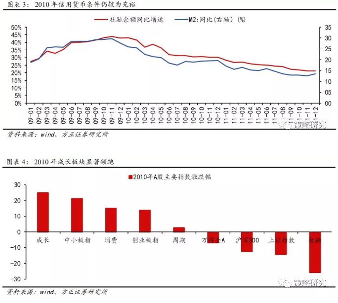 2、2010年宏观经济位于V型反转后的高位企稳阶段,货币信用环境在Q4出现明显转向。估值调整和业绩修复是市场进入震荡格局的主要逻辑,在此背景下成长板块跑出长牛,全年电子、医药生物、机械设备领涨。