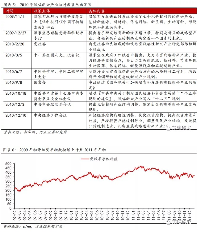 2010年以来战略新兴产业扶持力度逐步增强,科技行业成为政策红利行业,成长板块景气度大幅提高。2009年7月政治局会议强调调结构,在此背景下,2009年11月,温总理向首都科技界发表了《让科技引领中国可持续发展》的讲话,首次将新能源、节能环保、电动汽车、新材料、医药、生物育种和信息通信七大产业列为战略性新兴产业。随后一系列配套政策逐步出台,2010年3月温总理在政府工作报告中指出大力培育战略性新兴产业,抢占经济科技制高点。2010年9月国常会审议并通过《国务院关于加快培育和发展战略性新兴产业的决定》,随后2010年10月决定正式发布,写入“十二五”规划,12月的经济工作会议亦提出要调整优化产业结构,改造提升传统制造业,扎实发展战略型新兴产业。此外,2010年1月国常会敲定了三网融合的时间表和路线图,为推动以信息技术为代表的新兴产业发展提供了重要的基础设施支撑。科技创新的战略和“十二五”规划明确了信息技术行业将在长时间内享受政策红利,利好成长行业业绩预期,长期景气度大幅提高。