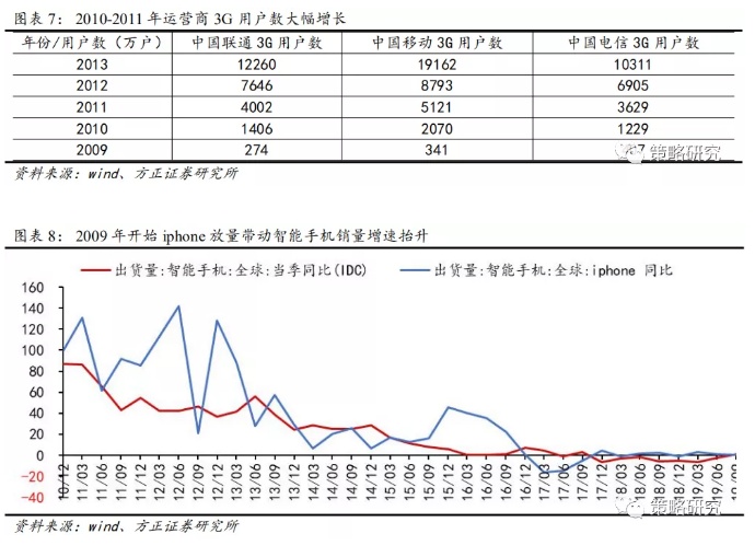 2010年全球移动互联网浪潮启动,智能手机引发一轮消费电子的热潮,助力成长板块成为A股优质赛道。从科技产业周期来看,费城半导体指数2009年初开始其结束了长达多年的下行开始缓慢抬升并一直持续至2011年年初,指数由200增长到了470,上涨幅度超过2倍,标志了新的科技产业周期正在兴起。产业周期的兴起有两方面因素,一是由于全球经济经历了金融危机之后开始恢复,提供了良好的宏观层面条件;另一方面则是以iPhone为代表的智能手机补齐了3G的最后一块拼图,通信技术实现了2G到3G的跨越。2007年1月苹果发布第一代iPhone,3G应用上的短板才得以补齐,用户才能真正体会到3G较2G相比带来的改变,比如传送数据、视频、上网、游戏等,移动互联网浪潮由此开启。具体到国内来看,2009年10月31日,iPhone3G和iPhone 3GS两款苹果手机正式登陆中国,虽然价格惊人,但在中国引发购买狂潮,带动智能手机销量翻倍,并带动产业链相关公司业绩出现反转。随后2010年6月8日,具有划时代意义的iPhone 4正式发布,其革命性的功能设计奠定了其在智能手机的引领地位,在iPhone4的销售总量中,中国买家一度占到了60%。消费电子的热潮以及全球半导体需求的提高带动了我国产业链上下游相关公司业绩放量,科技产业周期的兴起为电子、计算机行业描绘了更高的成长性预期,成长板块的盈利兑现叠加空前绝后的发展前景推动了成长板块自此成为A股的高景气赛道。