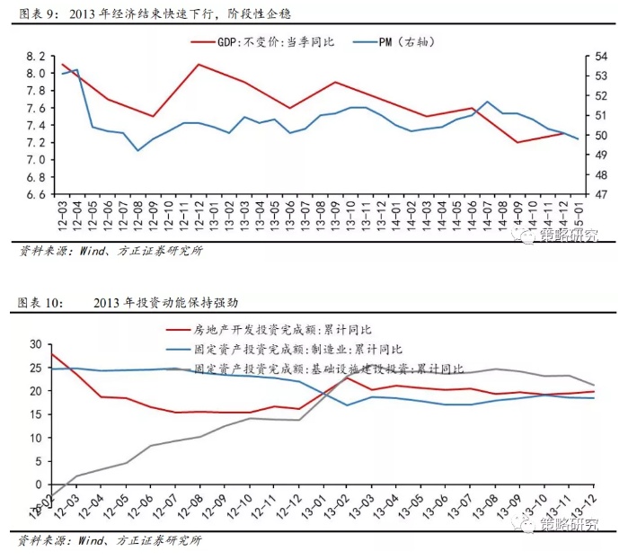 2013年经济结束快速下行,阶段性企稳,流动性缓慢收紧。经过2012年的新一轮刺激,经济在2013年结束快速下行趋势,阶段性企稳,全年实现7.8%的GDP增速,仅比2012年小幅下降0.1%,经济增长7.5%—8%的新中枢确立,且全年通胀无虞。经济企稳的主要动能来源于生产和投资的回升。PMI指数自2012年8月以来持续回升,由49.2升至2013年12月的51。工业增加值增速由负转正回升至10%-15%区间。2013年投资的三项动能保持强劲,制造业、基建和房地产投资增速均维持在15%以上。2012年的财政刺激主要通过批复大量投资项目,固定资产投资完成额自2012年8月持续回升,其中基建和房地产投资增速在2013年1月达到20%以上,拉动经济企稳回升。流动性方面,全年来看货币政策相对稳健、流动性缓慢收紧,融资成本小幅上行。其中货币工具使用方面,在2013年全年并未进行过降准降息或者升准升息的操作;在市场流动性层面,伴随着压缩非标与清理影子银行,社融增速发生了较大幅度的下滑,甚至出现过数次为负的情形,M2增速也处在缓慢下行的大趋势下。“钱荒”形成了短期流动性扰动,流动性管理主要作用于银行间市场,融资成本并未实质性大幅走高。