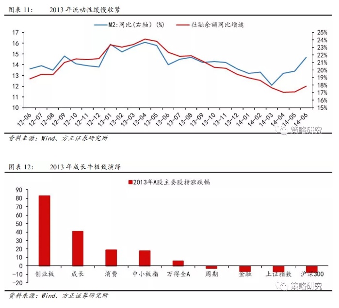3、2013年经济在结束快速下行后阶段性企稳,流动性环境处于缓慢收紧的阶段。在A股估值大幅下降的背景下,业绩回升支撑市场走出震荡格局。创业板与主板市场呈现出冰火两重天的表现,全年传媒、计算机、电子领涨。
