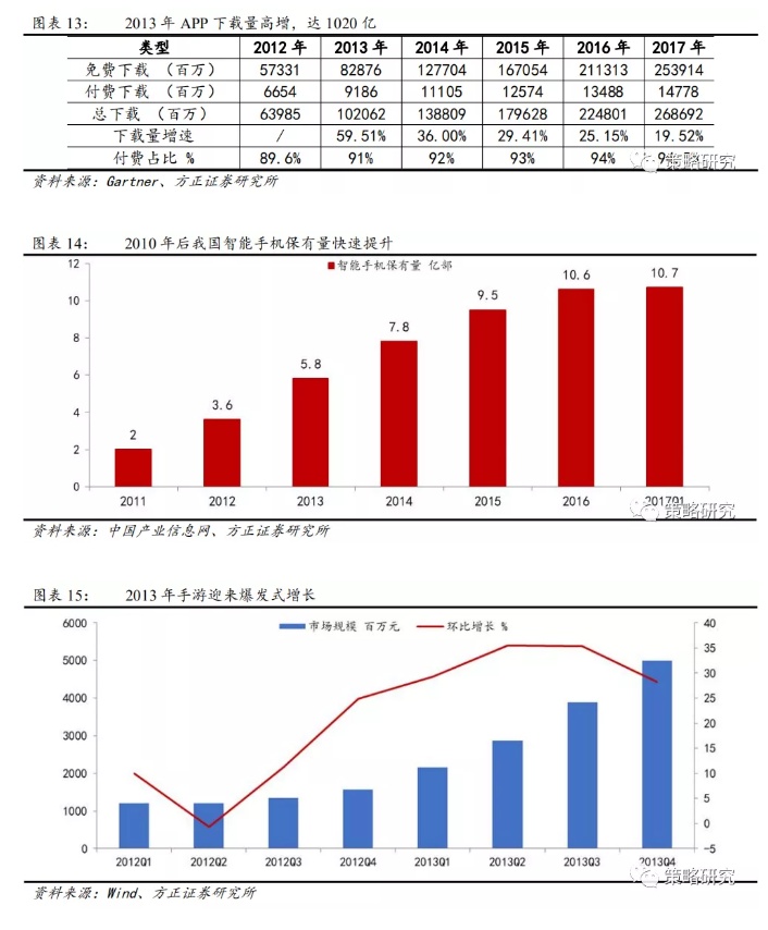 政策引领下,科技产业周期持续上行,产业重心向下游内容领域延伸,TMT行业景气度持续上行。经历了2012年的低迷之后,2013年全球半导体产业迎来了温和复苏,智能终端、电视与计算机等传统的消费电子产品销量回升,推动半导体营业收入的快速增长。同时,2010年iPad问世,此后三年,三星、华硕、LG、亚马逊、谷歌纷纷推出各自的安卓系统平板电脑,组成了第一批安卓平板阵营,国内平板品牌也相继问世,推动了平板电脑在国内的快速普及,全球智能手机制造商开始纷纷推出大屏幕产品,推动了智能手机、平板电脑、面板、摄像头、光模块等重要消费电子及零部件订单的增长。普及率快速提升后,下游应用开始具备了爆发的契机,内容端首先迎来爆发,2013年成为手游元年、国产电影元年、视频付费元年。2013年手机网络游戏用户数突破3.1亿,手机网络游戏市场规模全年保持了30%以上的季度扩张速度,全年市场规模达到139.19亿,相比2012年的53.27亿增幅超过160%。随着游戏市场的火热,游戏产品分发渠道竞争也同步升级,2013年再融资与并购重组均处于宽松周期,年内A股上市公司出现6家游戏渠道公司并购,涉及金额达128亿元,移动互联网的重要商业逻辑得到确认。文化传播领域也迎来爆发式增长。2013年全国总票房217.69亿元,同比增长27.51%。全年内地上映电影305部,其中60部电影票房过亿,国产片占到了33部。国产影片票房127.67亿元,同比增长54.32%,占比58.65%,国产片占比开始超过进口片。与之相伴随的视频领域市场规模同样进入快速扩张阶段,移动互联网及新媒体的出现为内容领域打开了市场空间,产业重心由硬件向内容及应用领域延伸,利好TMT行业长期业绩放量,持续成为高景气赛道。