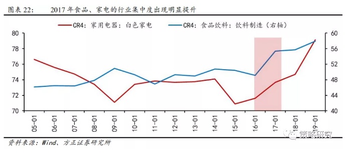 业绩增速及稳定性是决定行业走势的胜负手,食品与家电业绩增速的相对优势以及稳定的业绩输出支撑其领跑,而钢铁主要受益于供改。在2017年流动性不断收紧的背景下,业绩成为决定市场走势的胜负手,而业绩增速高且稳定的行业往往在震荡市中具有明显超额收益。2017年食品饮料和家用电器业绩增速的相对优势以及稳定的业绩输出是支撑其领跑的核心逻辑,四个季度食品饮料和家用电器的净利润增速均为正,全年增速分别为30.23%、32.11%,均创下阶段性新高。具体来看,行业集中度的提升是消费板块业绩保持高增速的主要动力。在消费升级的大潮下,消费者对高质量产品的需求程度进一步提升,实力雄厚的龙头企业优势凸显,而不能顺应市场需求变化的中小企业则面临被淘汰的境地。2017年饮料制造CR4提升了2.04个百分点,而白色家电CR4提升了6.20个百分点,行业集中度的提升使消费板块业绩更稳定,保证了在震荡市中取得超额收益。此外,钢铁在2017年取得超额收益的主要原因也是业绩的大幅改善,由于供给侧结构性改革等政策的推动,在过剩产能不断被出清、落后产能不断被淘汰的背景下,钢铁行业盈利出现大幅好转,行业景气程度得到了明显提升。全年钢铁的净利润同比达到了271.32%,其中Q1、Q3两个季度的净利润增速均保持在400%。