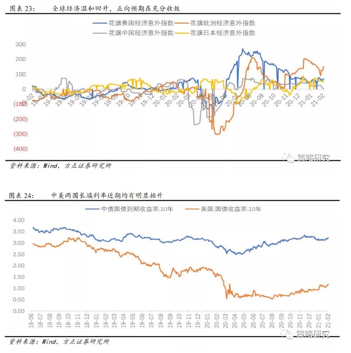 国内经济复苏的势头有所放缓,海外经济加速复苏。国内经济方面,1月PMI回落0.6个百分点至51.3,大部分分项指数均回落,但库存有所回升,表明需求回落的幅度大于生产回落的幅度,“就地过年”对生产的拉动效应可能不如之前市场预期的乐观,对经济影响可能整体偏负面。从1月的高频数据来看,生产端开工率相比于去年11月份峰值均有下降,但较12月低点有所回升。需求端方面,1月汽车和地产销量均维持较高增速。总体而言,1月经济相较于去年11月的峰值有所回落。从海外经济来看,美国经济复苏势头强劲,美国1月PMI继续扩张,ECRI领先指标加速上升,十年期国债收益率逼近1.2%,疫苗接种范围扩大之后,疫情数据明显好转。此外,韩国出口连续两个月维持在10%以上的增速,亦表明全球经济处于加速恢复的趋势之中。
