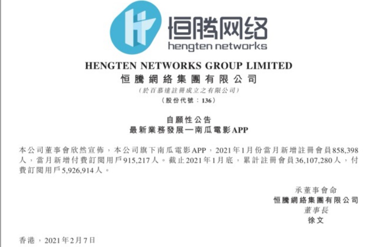 2月7日,恒腾网络(00136)发布公告,旗下南瓜电影APP一月新增注册会员85.8万人,新增付费会员91.5万人。截至1月末,南瓜电影累计注册会员3610.7万人,付费订阅用户592.7万人。