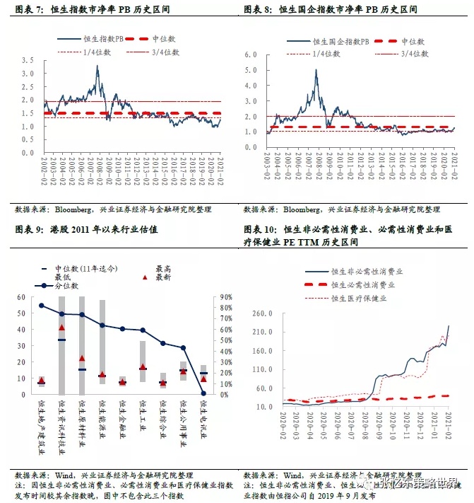 截至2月5日,恒指预测PE(彭博一致预期)为13.1倍,恒生国指预测PE为10.4倍,均处于2005年7月以来的中位数和3/4分位数之间。