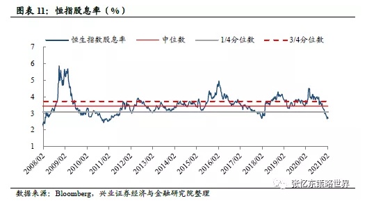 当前恒生指数的股息率为2.70%,低于上周五的2.78%,低于2006年9月以来的1/4分位数水平。